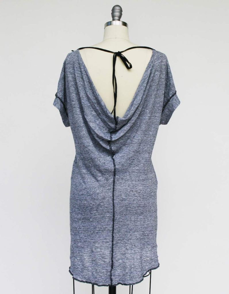 Long-line drape-back top with tie-neck in a sensuous striped linen jersey.